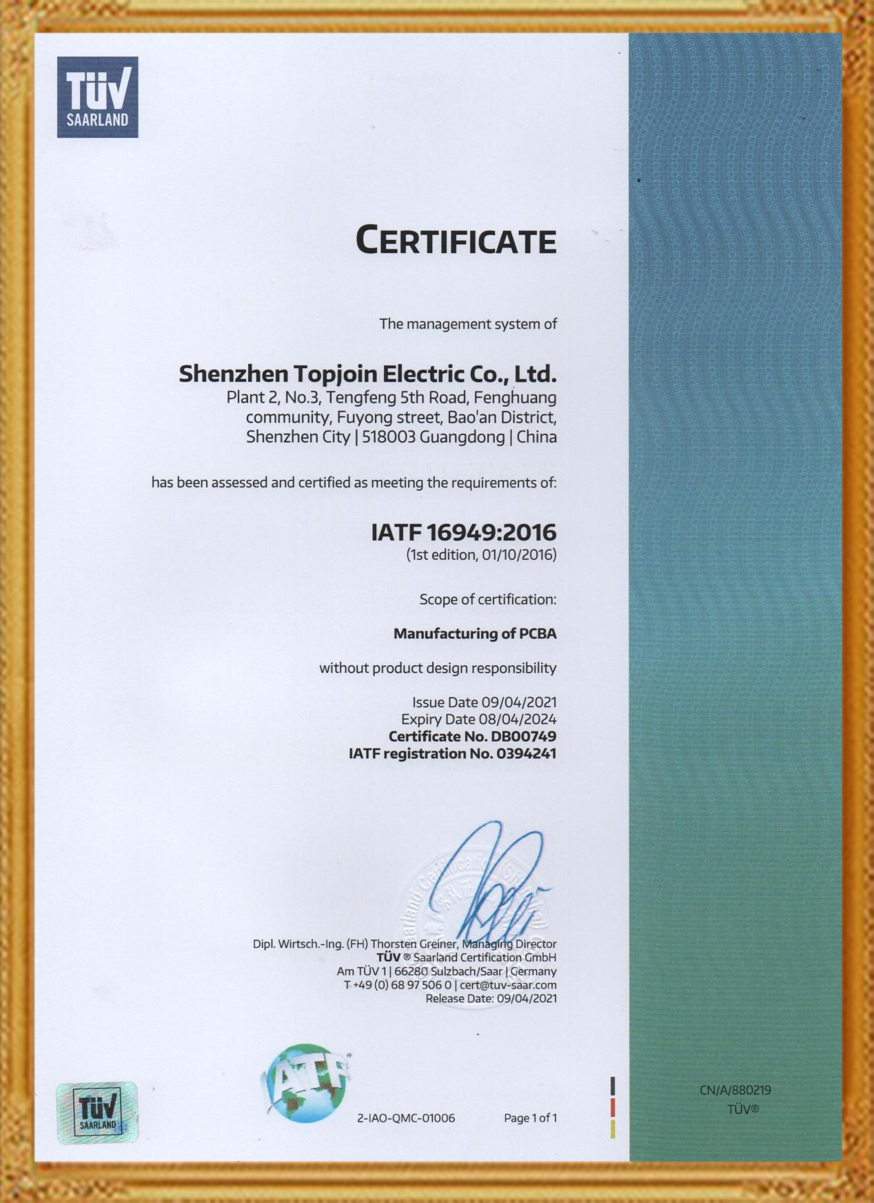 歐洲權(quán)威測試機構(gòu)專利證書
