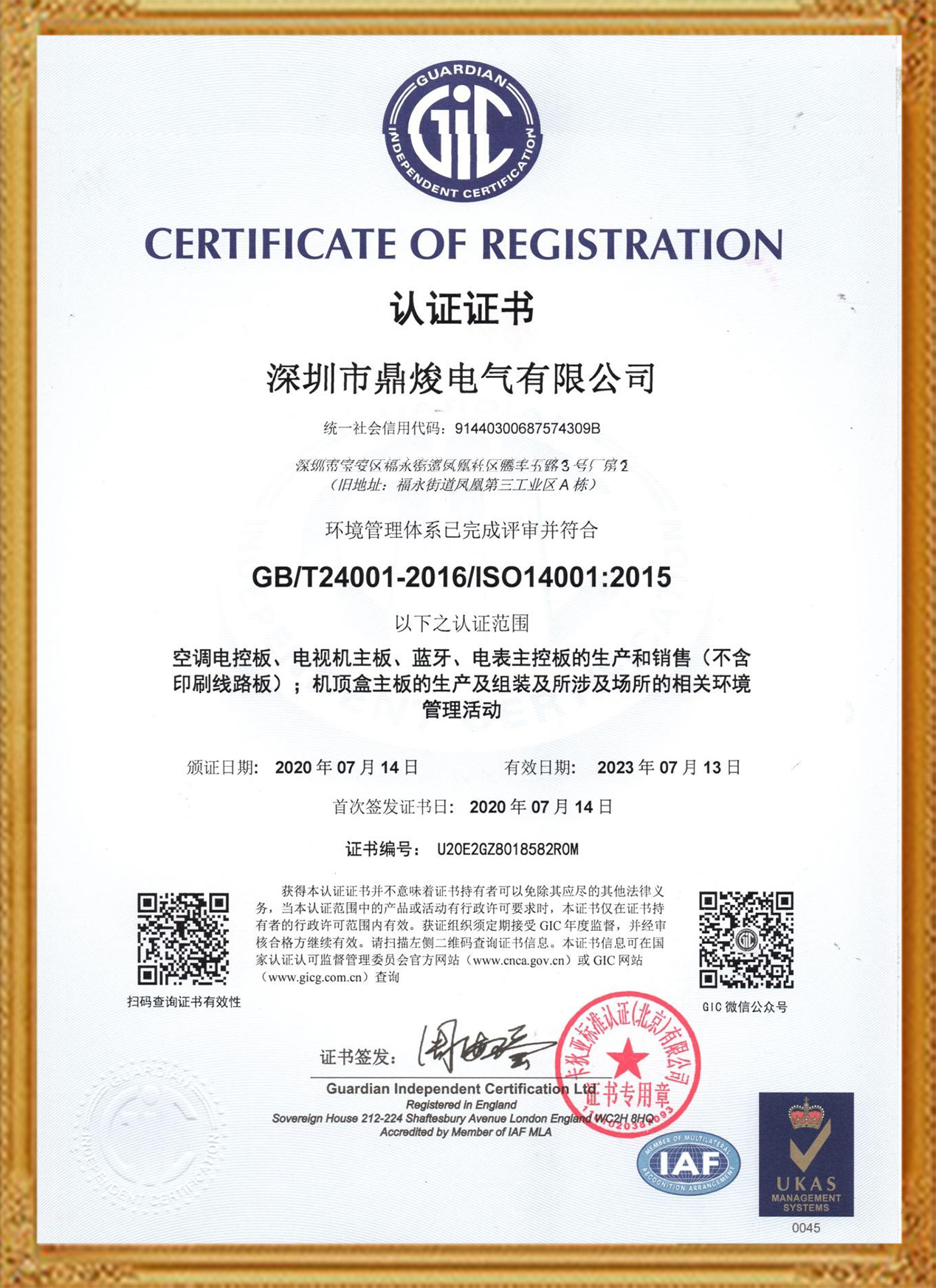 GIC認證專利證書